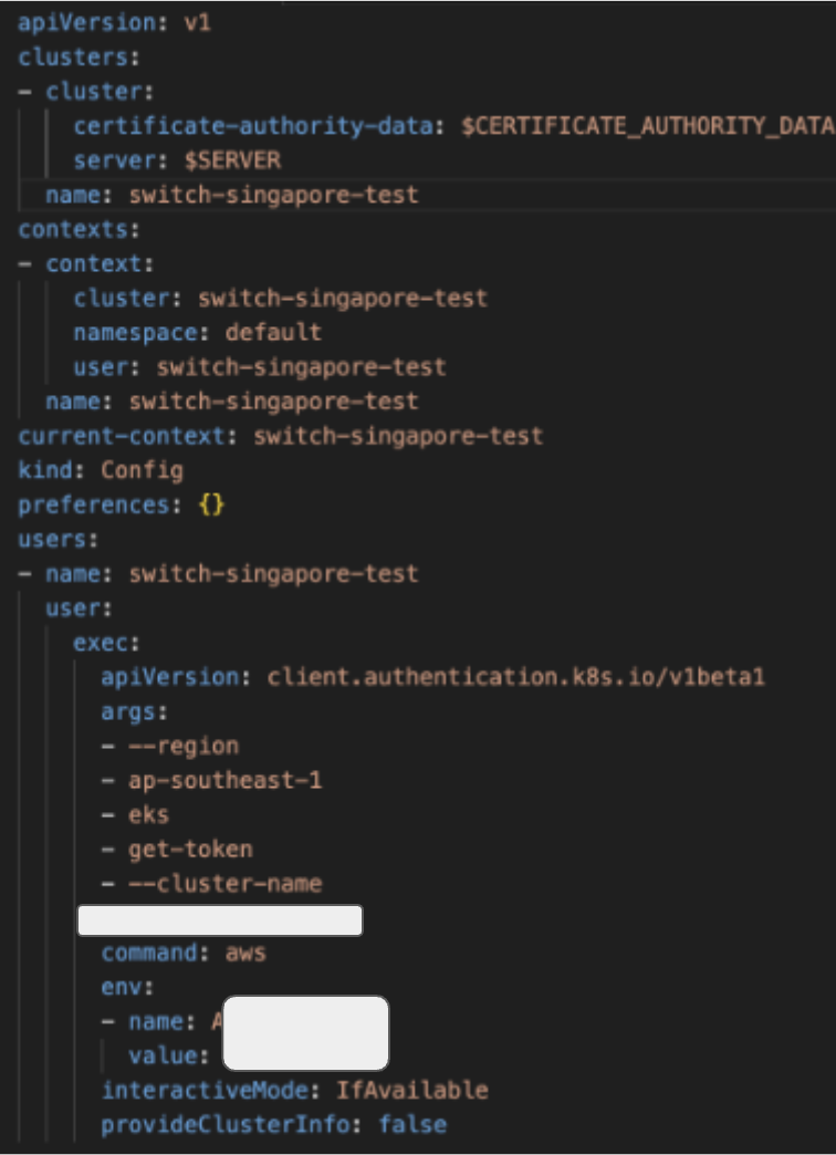 Langkah terakhir adalah mengisi bagian 'user'. Pada bagian '--cluster-name', masukkan nama klaster yang digunakan saat instalasi (contoh: singapore-test). Kemudian, untuk env:name dan env:value, masukkan informasi kredensial AWS Anda. Informasi kredensial AWS dapat ditemukan dalam file ~/.aws/credentials. Gunakan informasi kredensial yang sama dengan yang digunakan saat menginstal EKS.