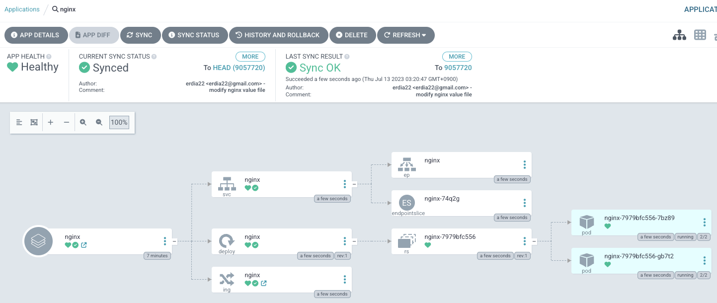 Dengan demikian, jika pengguna mengubah jumlah pod secara manual menggunakan perintah, tetapi opsi 'Automated' diaktifkan, ArgoCD akan secara otomatis menyinkronkan status saat ini dengan sumber Git, sehingga jumlah pod tetap 2.