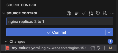 Sekarang, mari kita ubah jumlah pod dari 2 menjadi 1 di sumber Git. Kita akan mengubah opsi 'replicaCount' dalam file nilai Helm NGINX.