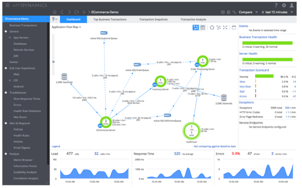 Untuk menampilkan daftar transaksi AppDynamic menggunakan table dan tampilan air terjun untuk memantau transaksinya. Tapi tidak seperti X-View, daftar transaksi APpDyanmic tidak menampilkan informasi profil dalam tampilan yang sama dan memerlukan navigasi lain untuk melihat struktur profil.