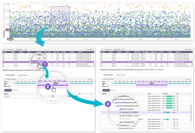 Untuk diagnostic yang lebih cepat AOM Jennifer melakukan pendekatan dengan menggunakan distribusi bukan statistik, X-View memvisualisasikan semua transaksi dan memungkinkan untuk menemukan pola yang sulit dilihat atau dideteksi menggunakan grafik biasa. X-View mampu melihat informasi profil transaksi secara detail hanya dengan menarik pada titik yang bermasalah yang ada pada grafik.